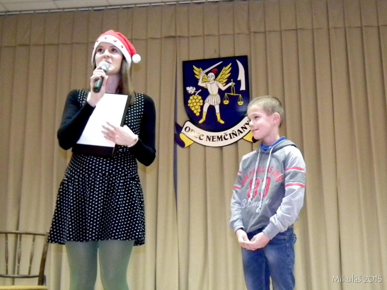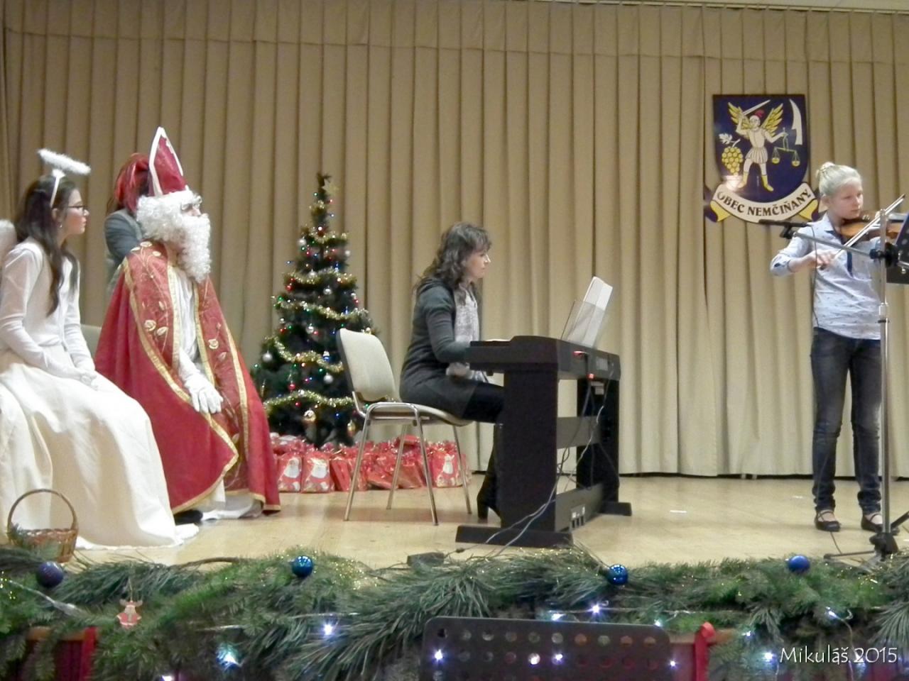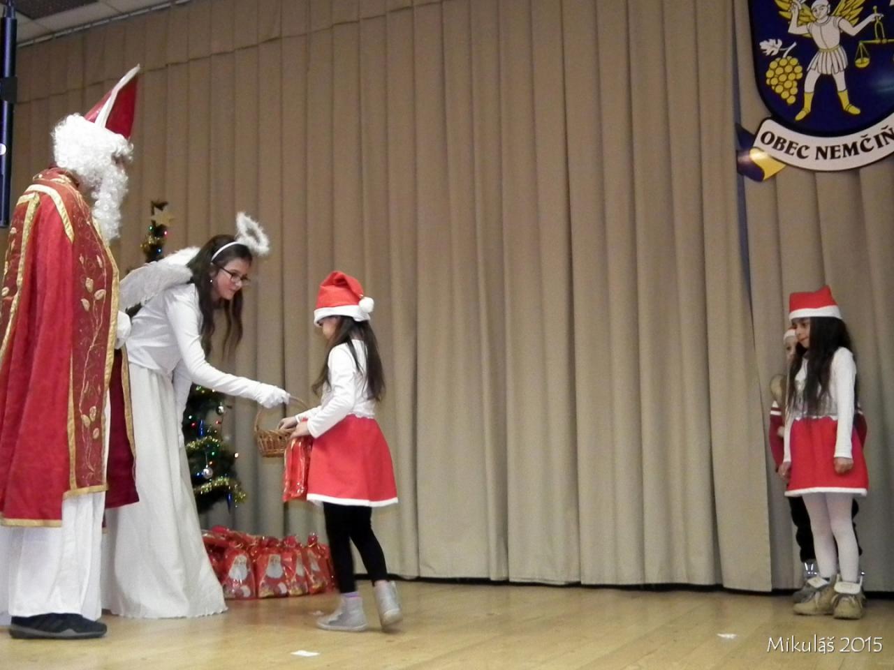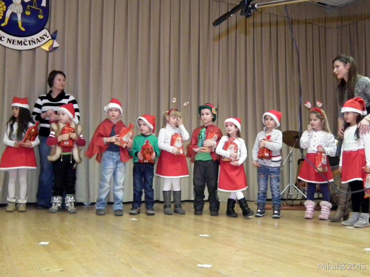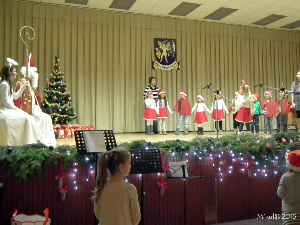 Už tradičné stretnutie detí s Mikulášom sa uskutočnilo v nedeľu 6.12.2015 o 17.hod. v Kultúrnom dome v Nemčiňanoch. Deti z Materskej školy privítali Mikuláša básničkami, ktoré sa z príležitosti tejto radostnej udalosti naučili. V kultúrnom programe vystúpil Števko Rebo aj žiaci umeleckej školy v Tlmačoch. Nakoniec boli všetky deti obdarované darčekami. Pre všetkých prítomných bol pripravený chutný vianočný punč.