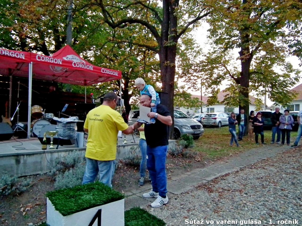 Už aj u nás v Nemčiňanoch sa uskutočnil 1. ročník súťaže vo varení guláša. Akcia sa uskutočnila v sobotu 1.10.2016 v areáli budovy spoločenského významu. Počasie nám prialo, bol to pekný slnečný deň a aj podvečer bolo príjemne – babie leto v plnej kráse. O najlepší guláš súťažilo pätnásť družstiev. Počas varenia nás zabávala spevom hudobná skupina Márnosť šedivá a deti zabavili kolotoče. Súťažné družstvá začali variť o trinástej hodine a o sedemnásť tridsať odovzdali odbornej porote svoje kuchárske dielo a o osemnástej hodine porota vyhlásila najlepších päť gulášov.